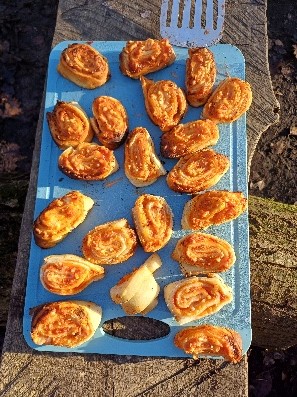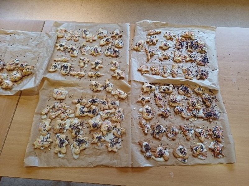Natürlich durfte das jährliche Kekse backen nicht fehlen. Bei frostigen Temperaturen ließen sich die Waldhörnchen die Pizzaschnecken aus dem Lehmofen, sowie den Kinderpusch vom Feuer erwärmt schmecken. Zudem wurde am Feuer leckeres Stockbrot gebacken und aus Kerzenreste wurden neue Kerzen gegossen. Zeit für kreative Momente dürfen in der Adventszeit auch nicht fehlen. So bastelten die Waldhörnchen Sterne für die Bauwagenfenster und aus Draht, eine Perle und einer Feder sind bunte Anhänger entstanden.