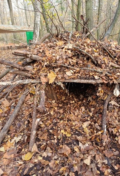 Die Waldhörnchen haben am Bauwagenplatz eine Hütte aus Ästen, Zweigen und Reisig ohne Hilfe von einem Erwachsenen gebaut. Während des Baus gab es in der Gruppe ein sehr harmonisches Miteinander. Die Kinder trafen untereinander Absprachen und es wurden gemeinsame Entscheidungen getroffen. Jeder hatte seine Aufgabe und alle haben ihren Beitrag zum Bau geleistet. Nach und nach ist die Hütte immer größer geworden und sie wurde ins Spiel mit einbezogen.