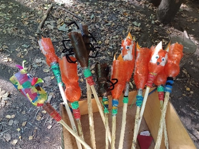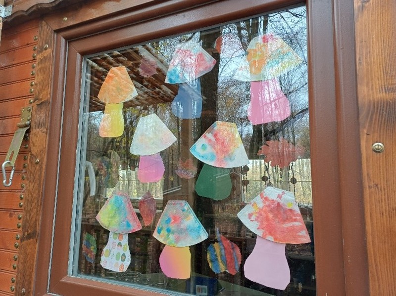 Zudem haben die Waldhörnchen bunte Pilze gebastelt, die nun die Fenster am Bauwagen schmücken. Dafür wurden Filtertüten durch Pipetten mit bunter Farbe beträufelt. Der Pilzstiel wurde aus Pappe ausgeschnitten und beide Teile zusammengeklebt. Außerdem haben die Waldhörnchen schon damit angefangen, ihre Laternen zu basteln. Dafür wurden zunächst Stöcker gesammelt und geschnitzt. Danach konnte an jedem Stock eine PET-Flasche befestigt werden. Im Anschluss wurden diese noch mit buntem Transparentpapier beklebt und so sind lauter Füchse, Eulen oder Spinnen entstanden.
